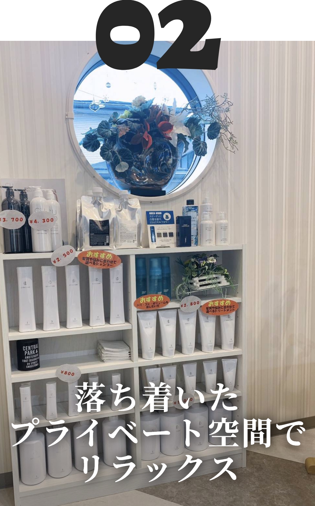 当店では、お客様一人ひとりの髪質やお悩みに合わせて、約8種類のシャンプーから最適なものを選び、丁寧に洗い上げます。